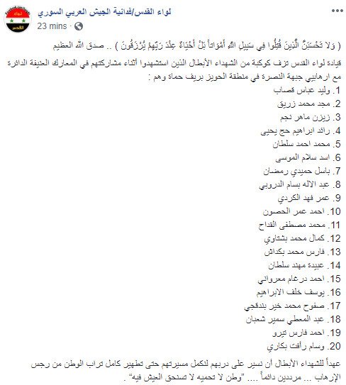 Syria: Al-Quds Brigade officially announces no less 20 of its fighters were killed in clashes with Rebels in Huwayz, highlighting significant involvement of this group on NW. Hama front.