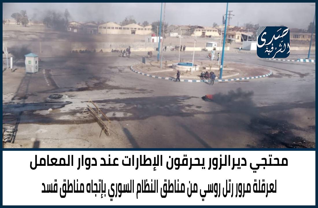 Deir Ezzor protesters burn tires at the Al-Maamal roundabout, to obstruct the passage of a convoy of Russian forces from the Al-Salihiya land crossing, which connects the SDF-controlled areas with the Assad government-controlled areas in Deir Ezzor governorate, amid tension in the area